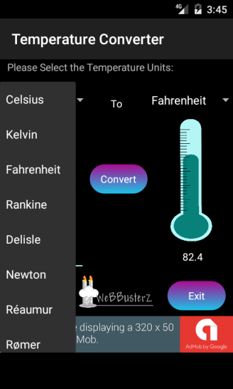 Para apoiar o desenvolvimento de aplicações móveis há um anúncio da bandeira no presente pedido, os anúncios são exibidos apenas se você estiver conectado à internet, você não precisa estar conectado à internet para usar este conversor temperatura em que também irá funcionar totalmente offline.
