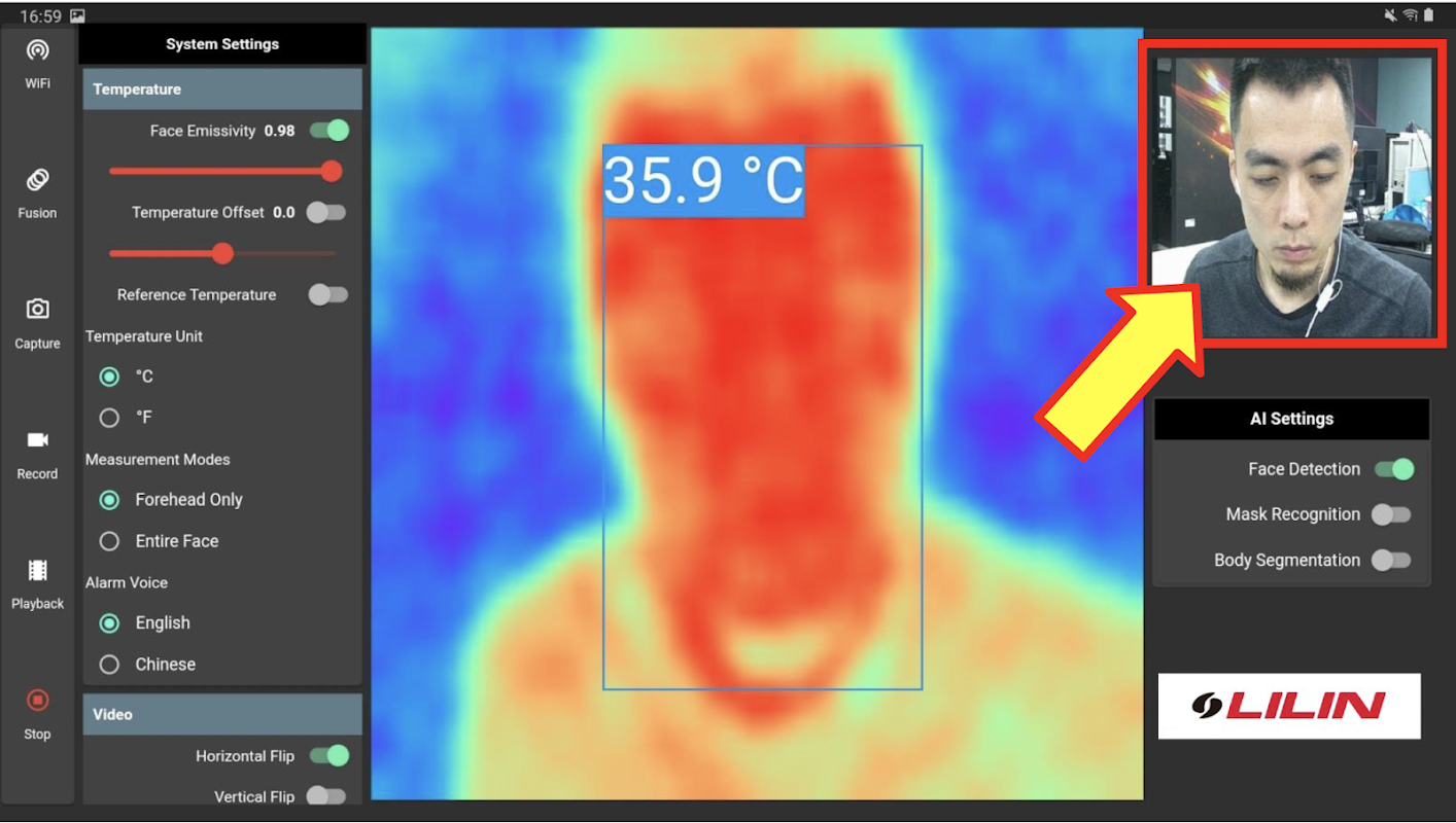 TempViewer é o aplicativo remoto para controlar e monitorar a câmera térmica WiFi. A interface do TempViewer é clara e os usuários podem clicar diretamente no botão de atalho, incluindo Conexão, Fusão, Captura, Gravação, Reprodução e Iniciar para executar várias funções. através do botão de fusão de imagem, e pode ajustar a intensidade da função para ler as informações com clareza Detecção por câmera de temperatura e verificação se as máscaras são usadas corretamente em áreas sensíveis como escolas, hospitais ou locais de transporte público.
