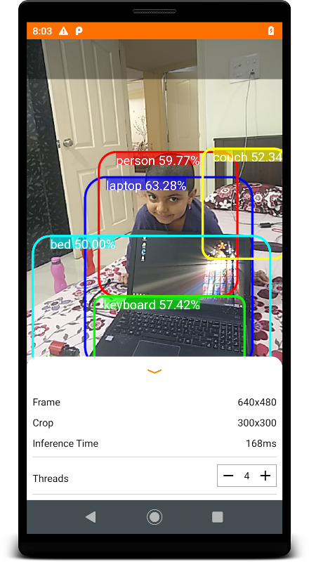 This is a camera app that continuously detects the objects (bounding boxes and classes) in the frames seen by your device's back camera, using a quantized MobileNet SSD model trained on the COCO dataset. These instructions walk you through the building and running the demo on an Android device.