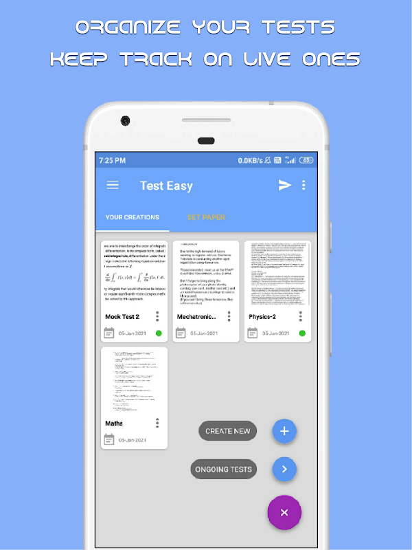 Os papéis de teste são salvos localmente no seu telefone, você terá uma lista de suas criações recentes. Test Easy permite que você navegue facilmente por todas as suas criações. Você tem permissão para