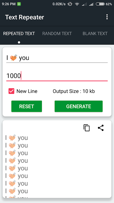 Using this application you can send the same message at multiple times. This app is low size APK. It is one kind of message repeater to send message repeatedly, and also you can set your repetition limit with new line text repetition. Very easy to use and required few click for your message repetitions.