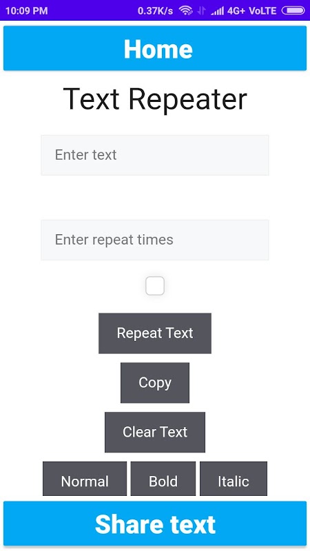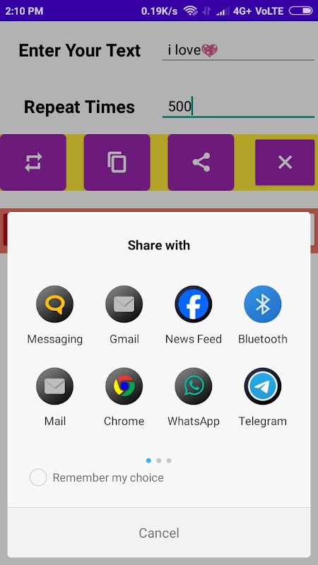 Depois que o usuário fornece o texto de entrada e os tempos de repetição, ele gera o texto, então você precisa copiar o texto e compartilhá-lo com outras pessoas através do botão de compartilhamento.