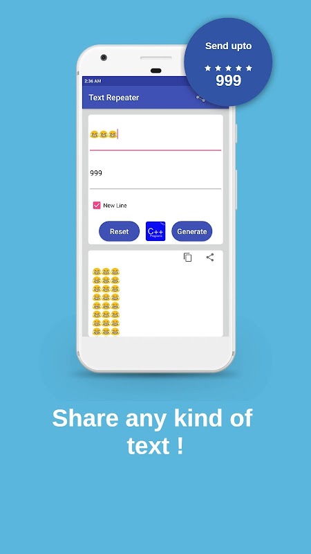 Repita texto e emojis até 10.000 vezes. Compartilhe, copie e bombeie mensagens de texto facilmente!