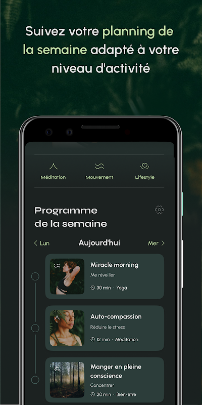 Uma das grandes funcionalidades deste aplicativo são as programações semanais de movimento, meditação e estilo de vida, desenhadas em forma de calendário para que você não precise mais escolher. Responda ao questionário e deixe-se guiar pelas escolhas oferecidas.