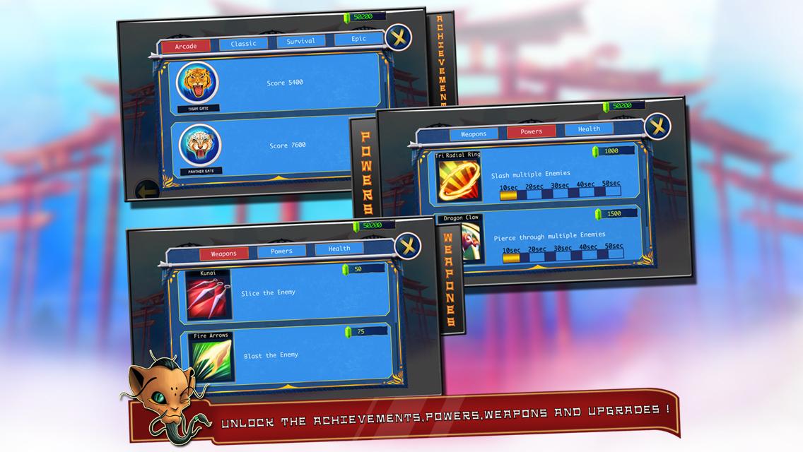 O Monge Gato não luta apenas com as próprias mãos; ele é versado em diferentes armas e possui alguns superpoderes. Aprimore os poderes e equipe as armas no Menu de Aprimoramentos usando as gemas compradas com dinheiro real ou obtidas no jogo.