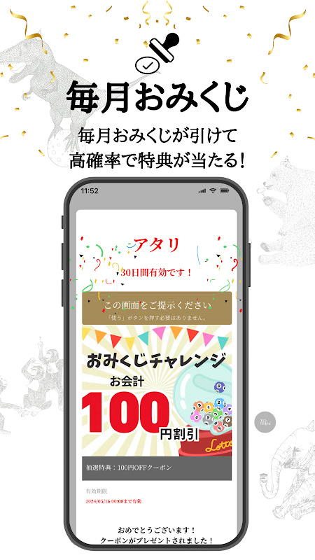 ・Você pode sortear um bilhete de loteria para ganhar um cupom de desconto uma vez por mês.