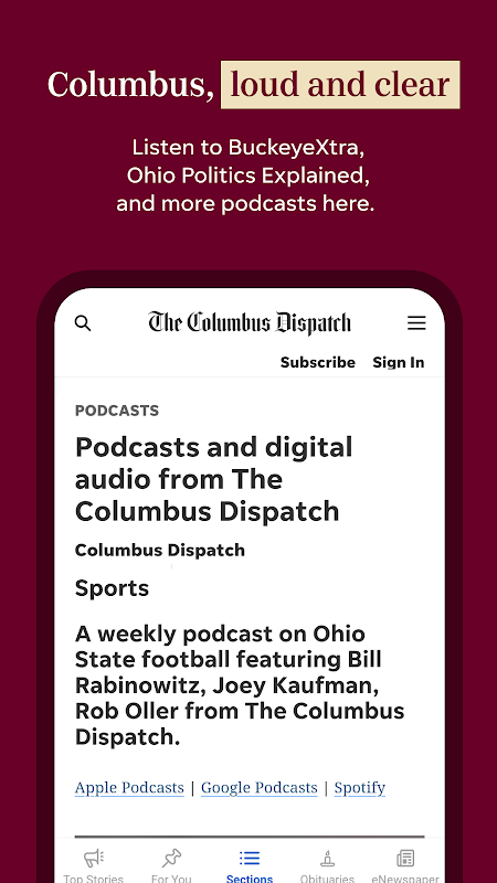 O aplicativo Columbus Dispatch está disponível para download gratuito, oferecendo acesso a artigos selecionados gratuitamente a cada mês. As assinaturas são cobradas na sua conta do Google Play após a confirmação da compra e renovam-se mensalmente ou anualmente, a menos que sejam desativadas nas configurações da sua conta do Google Play 24 horas antes do término do período atual. Para mais detalhes e suporte ao cliente, acesse "Suporte à assinatura" nas Configurações do aplicativo.