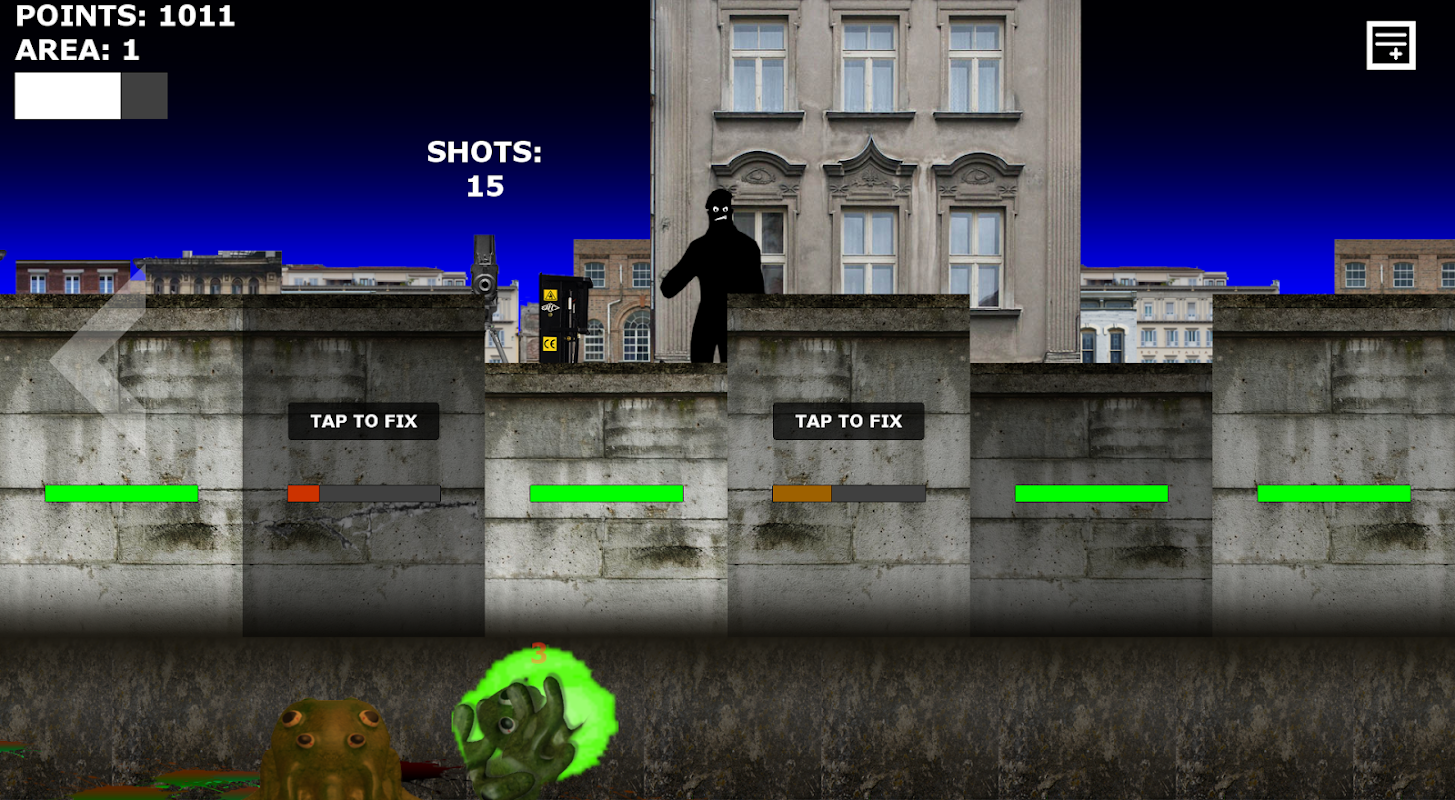 Earn points to fix walls and to buy items (bombs, alarms, etc...)