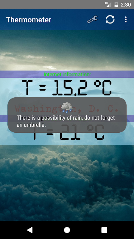 It has two different widgets for data from the Internet, and from sensor. In addition, you can enable status bar notifications about temperature.