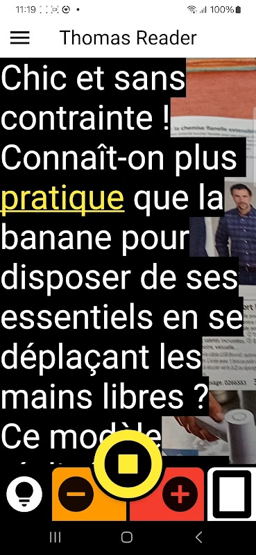 Simples de usar, o THOMAS READER usa a câmera do smartphone: - Mire usando a câmera - Pressione o botão central - E a reprodução de voz começa O texto lido em voz alta é exibido rolando na tela. Muitas configurações possíveis: tamanho da letra, velocidade de leitura, rolagem, etc. O THOMAS READER oferece dois modos de leitura: - leitura no modo Seta (novo), lendo o bloco de texto apontado pela seta no centro da tela. Prático para ler informações específicas.