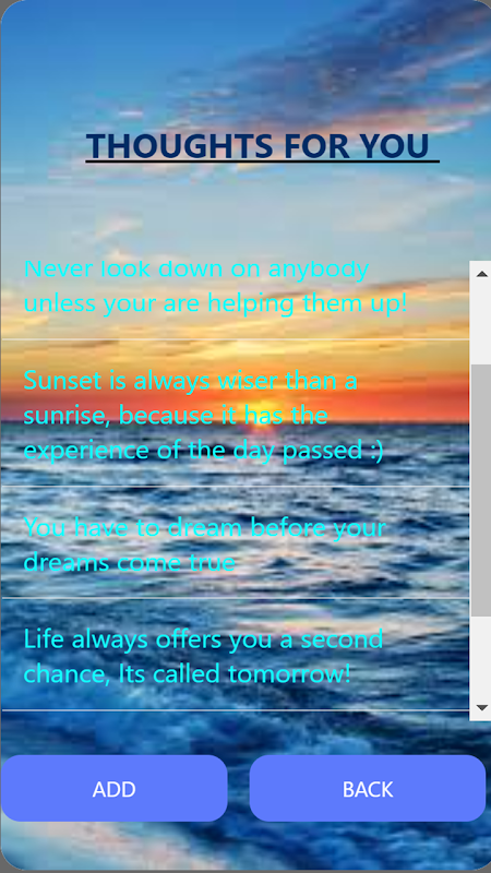 Um aplicativo motivacional que fornece pensamentos positivos para limpar a mente da depressão e da tristeza. depressão, ajuda a motivar os outros e a fazê-los sentir-se melhor.