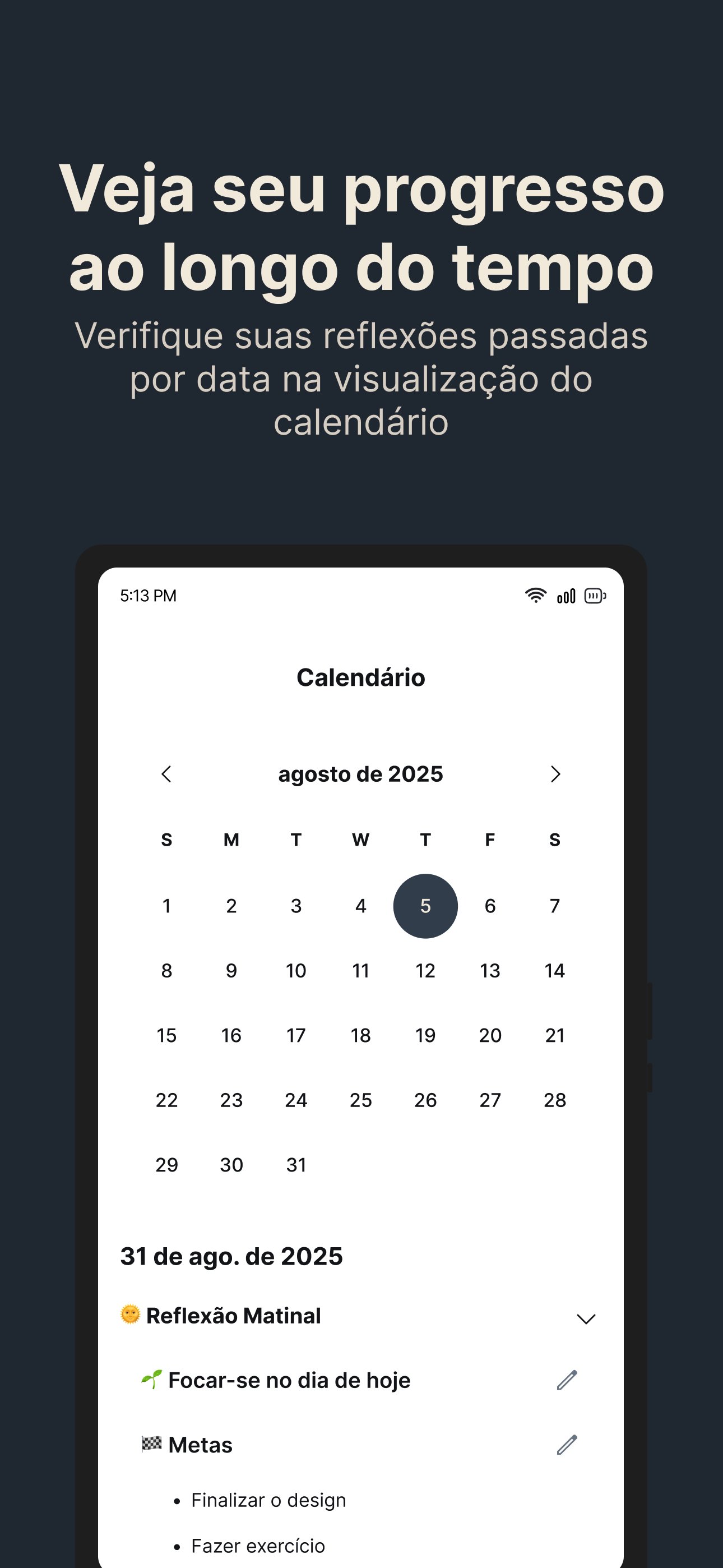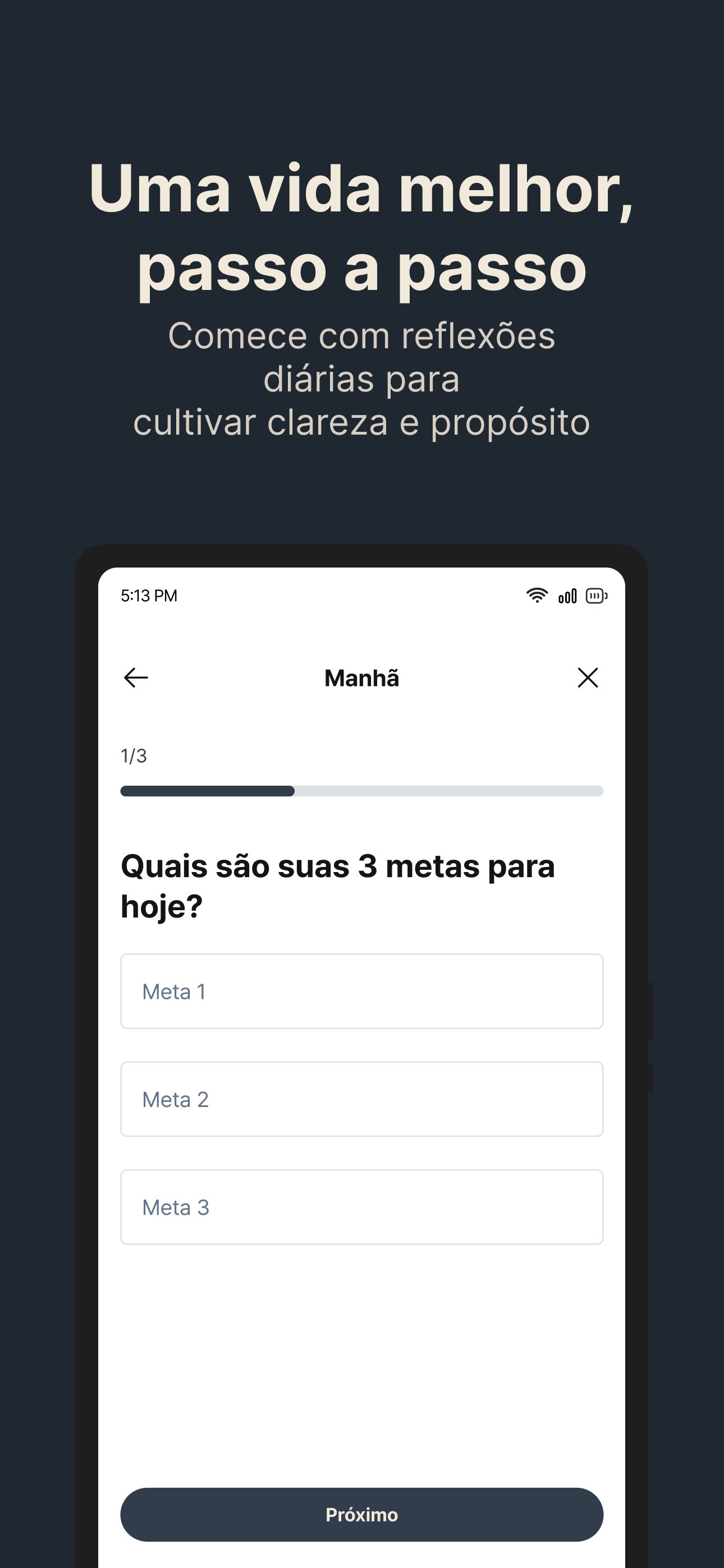 - **Reflexão matinal**: 3 metas, 3 gratidões, 1 afirmação