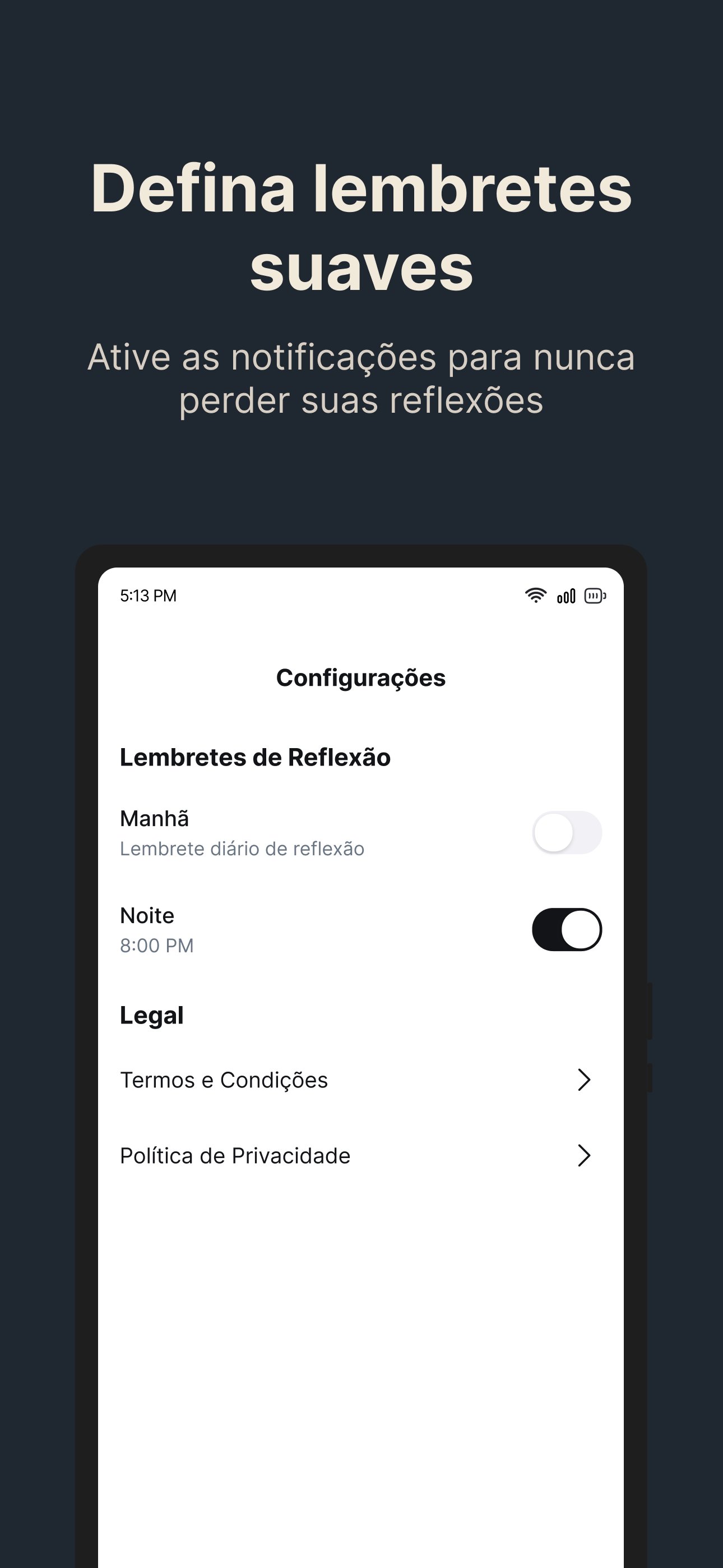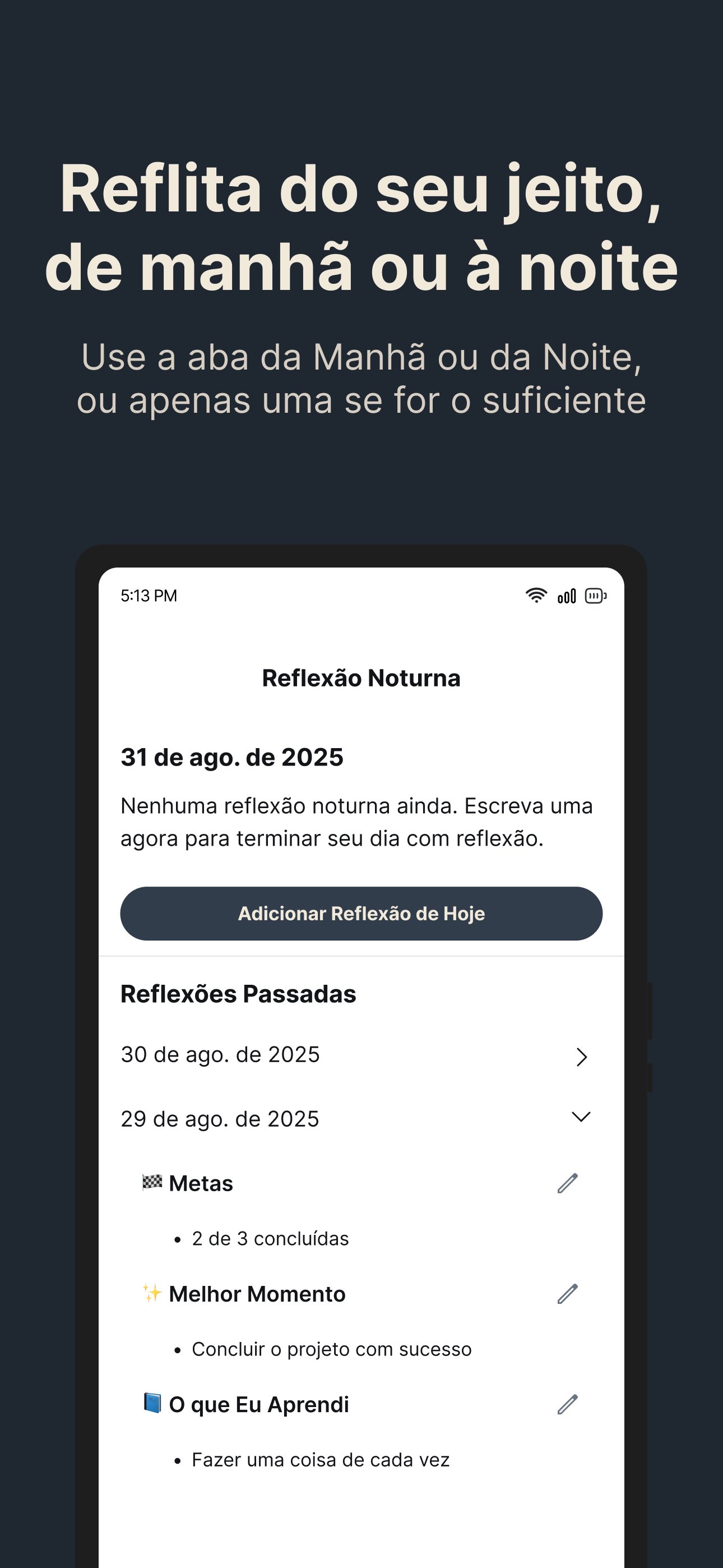 - **Reflexão noturna**: progresso, melhor momento, lição
