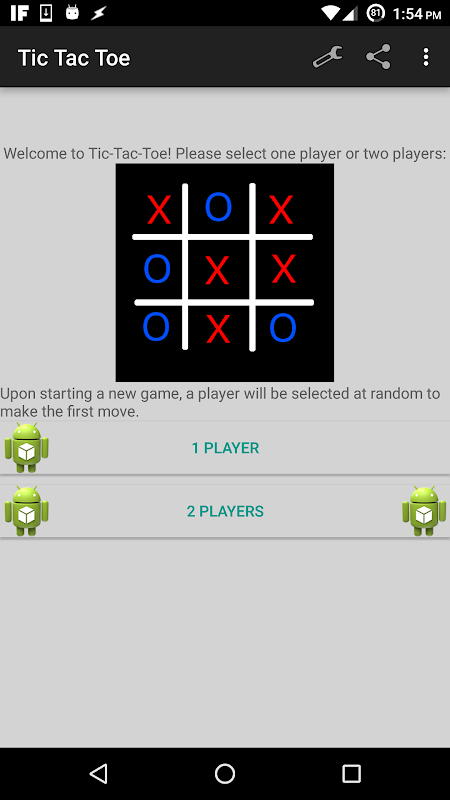 Por padrão, o jogador 1 coloca um X vermelho e o jogador 2 usa um O azul. Nos jogos com 1 jogador, o jogador humano é o jogador 1 (X) e o computador é o jogador 2 (O). A cor do X e O pode ser alterada nas configurações, bem como qual símbolo cada jogador usa.