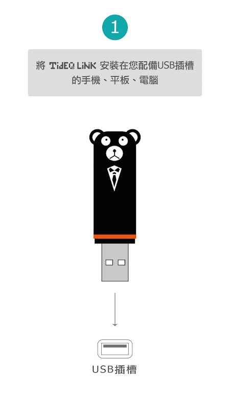 步驟 三: 將 TideQLink 產品 插頭 連結 接收 裝置 (手機 / 電腦 / 平板) 的 USB 插槽