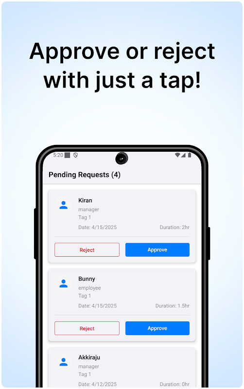 Quer você seja um funcionário registrando tarefas diárias, um gerente supervisionando os envios da equipe ou um administrador gerenciando aprovações em toda a organização, o Tikr simplifica seu fluxo de trabalho com acesso baseado em função e rastreamento de status em tempo real.