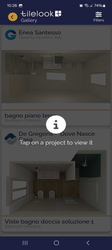 Com o aplicativo Tilelook você pode navegar e pesquisar todos os designs 3D foto-realistas (banheiros, cozinhas, salas de estar) feitos por profissionais Tilelook com pisos e produtos de revestimento reais e visualizá-los em 360 ° ou em Realidade Virtual no seu dispositivo.