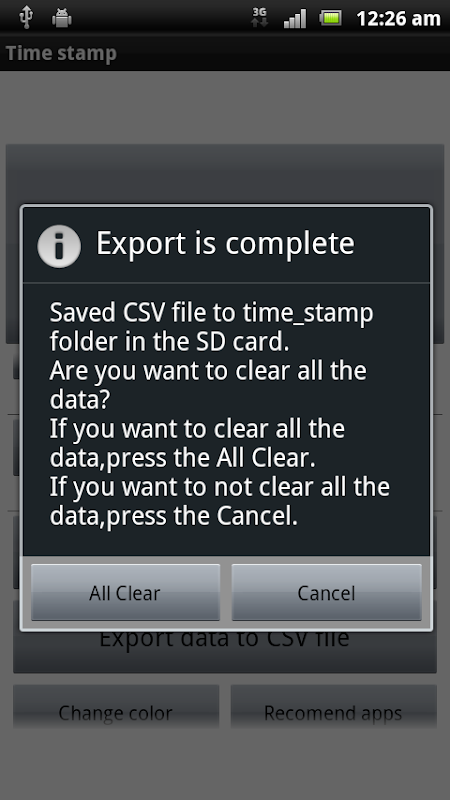 When you press the button "Export to CSV file " , all data will be exported all to the SD card or Internal storage (depending on the device) in the "Android/data/gj.timestamp/" folder .