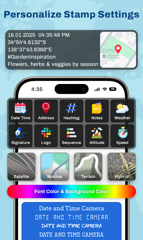 📌 Open the app and select the stamps you need—Date & Time, Map, Logo, Notes, etc