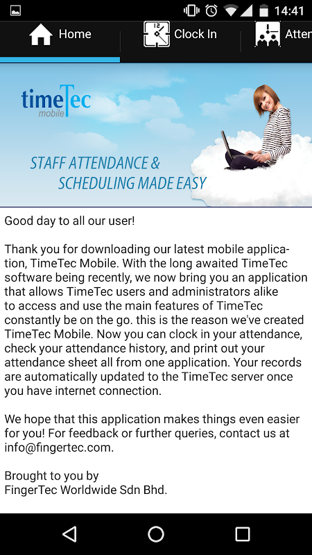 TimeTec Mobile is an application brought to you by FingerTec Worldwide that allows TimeTec users and administrators alike to access and use the main features of TimeTec from their mobile devices. TimeTec Mobile constantly communicates with the TimeTec server to bring you updated results of your clocking data, attendance sheets and so on.