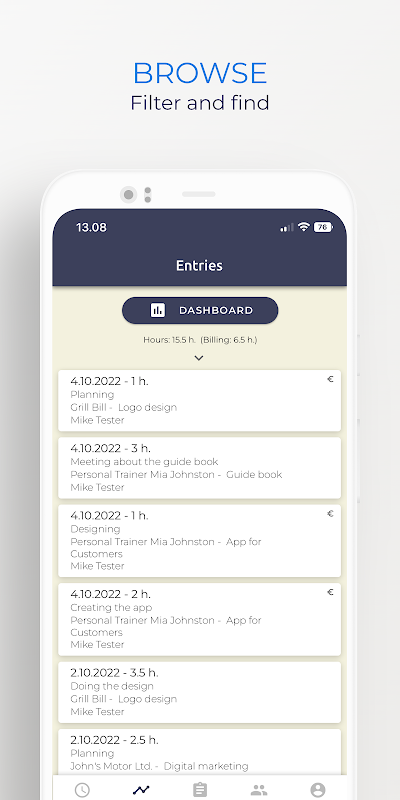 TinyTime é um aplicativo de rastreamento de tempo de trabalho GRATUITO e super fácil de usar que pode ser usado apenas ou com seus colegas. No aplicativo, você e seus colegas podem marcar horas de trabalho para um projeto e um cliente. Assim, você pode ver quanto trabalho é feito para um projeto ou cliente. Com um painel muito claro e fácil de entender, você pode descobrir com um vislumbre qual é o percentual de faturamento da sua organização ou quanto trabalho é feito para um projeto ou cliente.