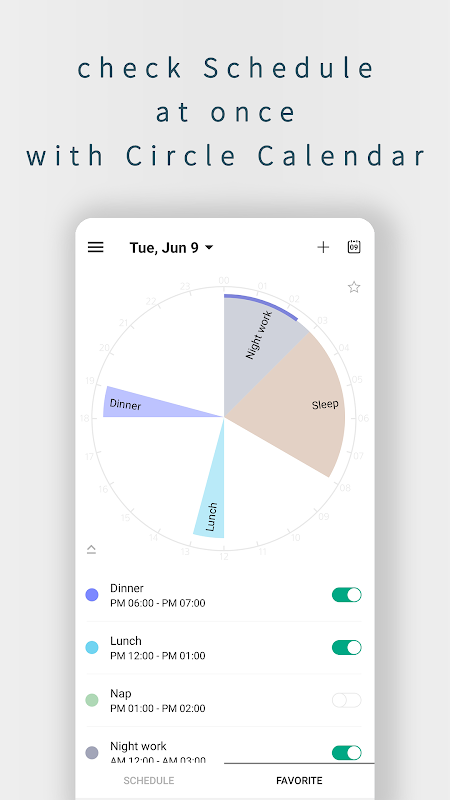Shows the schedule in a circular calendar that best describes the day.