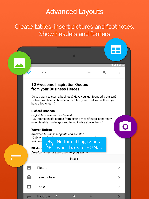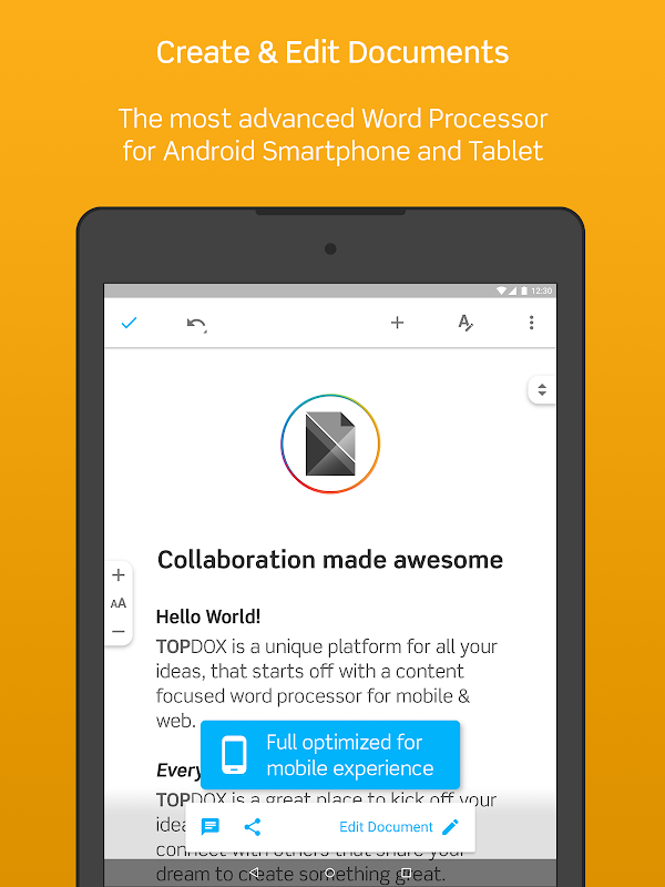 Experiente um dos processadores de texto mais avançados para Android. Crie e edite documentos Microsoft Word com funcionalidades avançadas como inserir tabelas, imagens, notas de rodapé e mais. Anote também documentos PDF.