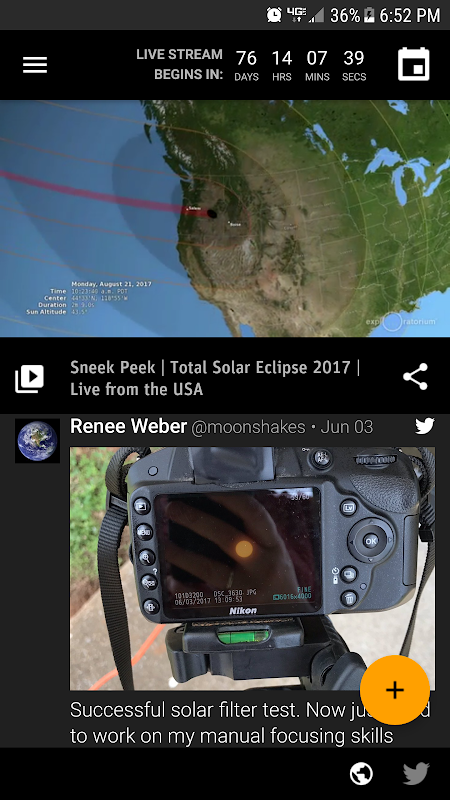 • Follow the conversation on Twitter using #eclipse2017, #solareclipse, and #totalsolareclipse using the app's Twitter View and share your tweets about the eclipse.