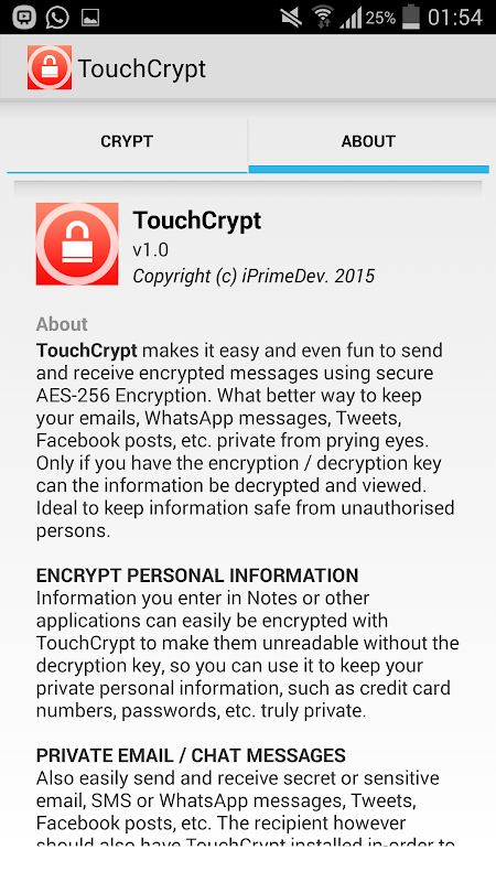 TouchCrypt makes it easy and even fun to send and receive encrypted messages using secure AES-256 Encryption. What better way to keep your emails, WhatsApp messages, Tweets, Facebook posts, etc. private from prying eyes. Only if you have the encryption / decryption key can the information be decrypted and viewed. Ideal to keep information safe from unauthorised persons.