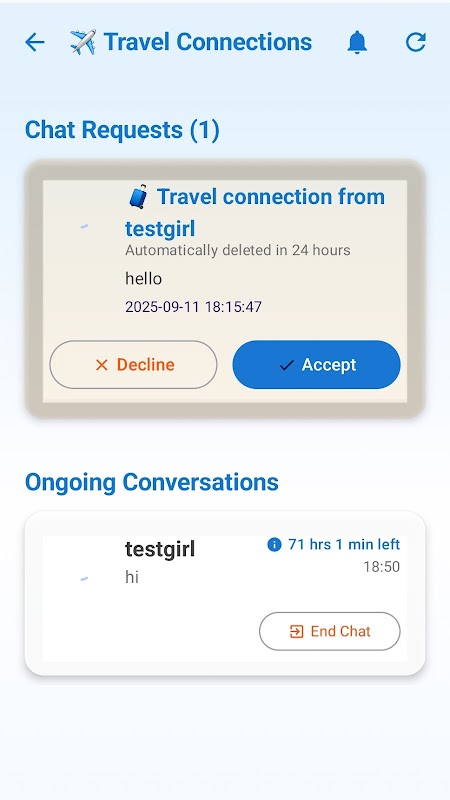 Conecte-se com outros viajantes que estão no mesmo lugar e na mesma hora que você. Defina um raio de busca para encontrar pessoas por perto, confira as datas e estilos de viagem, comece uma conversa e planeje explorar juntos — seja para um encontro casual ou para encontrar um parceiro de viagem.