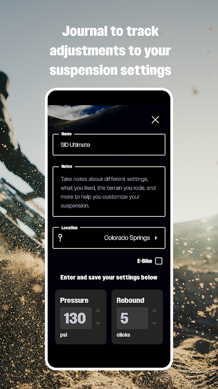 ▸ Recurso de diário para monitorar ajustes nas configurações da suspensão e capturar informações na trilha para analisar e melhorar sua experiência de pedalada