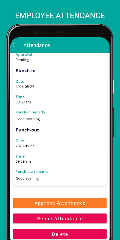 O funcionário pode registrar e registrar a presença com um clique. Assim que o comparecimento é marcado, a localização ao vivo do funcionário é rastreada pelo aplicativo e enviada ao administrador em intervalos regulares até que o funcionário marque a saída. Admin aprova cada atendimento.