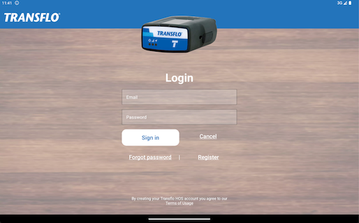 O portal permite que você acesse 6 meses de registros, além de informações de relatório do contrato internacional de imposto sobre combustível (IFTA). Para fazer login, visite https://my.transfloeld.com e insira as credenciais que você criou durante o processo de registro.