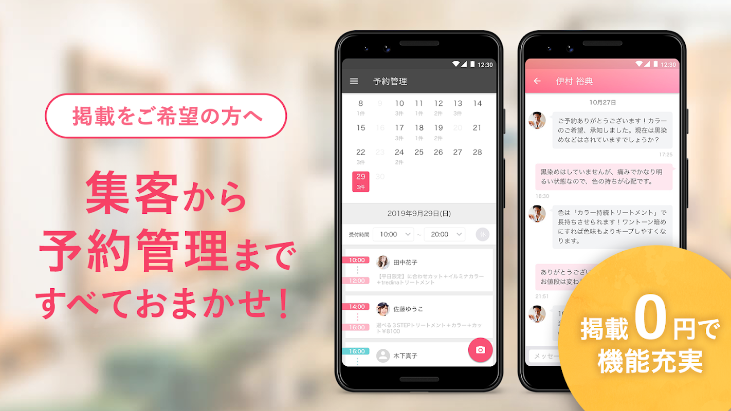 * メニュー掲載はもちろん、集客から予約管理まですべてこれ1つでOK。自動予約確定だから、施術中の予約申請にもスムーズに対応できます。