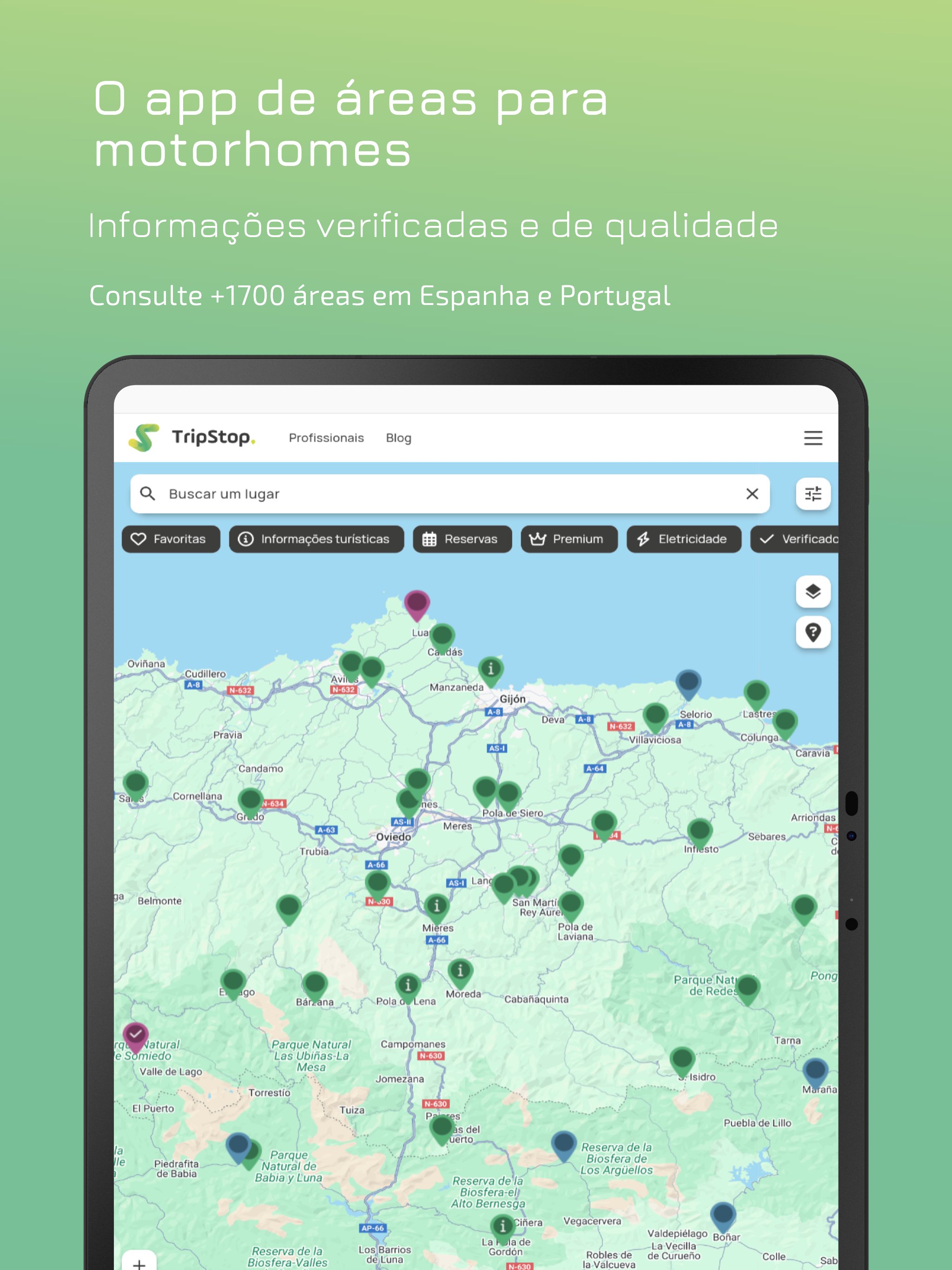 TripStop é o único aplicativo 100% gratuito com informações sobre mais de 1.700 áreas de autocaravanas em Espanha e Portugal.