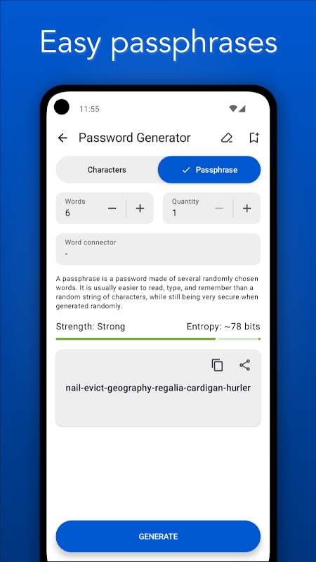 • Gerador de senhas: caracteres aleatórios ou frases-senha fáceis de ler, além de feedback de força/entropia