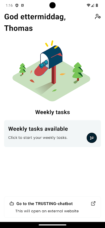 O aplicativo TRUSTING é uma ferramenta digital para pacientes. O aplicativo destina-se a complementar o monitoramento e o tratamento de pacientes em cuidados de saúde mental e foi desenvolvido para fins de pesquisa. Os usuários inscritos no estudo receberão uma série de perguntas semanalmente, abordando temas como sono e bem-estar, e serão solicitados a falar sobre diferentes tópicos, descrever uma imagem ou recontar uma história.