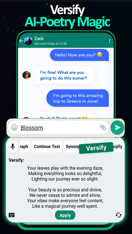 TypeSharp - TypeAI Keyboard economizará seu tempo ao conversar rapidamente usando os recursos de IA do teclado. Teclado TypeSharp desenvolvido com ChatGPT e GPT-4, desenvolvido para melhorar sua eficiência e precisão. Com teclado TypeSharp AI! você aproveitará as várias opções de escrita de IA com tecnologia GPT, que fornecem uma solução de digitação inteligente e eficaz e ajudam você a se comunicar corretamente, tudo a partir do teclado. Baixe TypeSharp - Teclado AI gratuitamente com acesso a um mundo de recursos avançados!