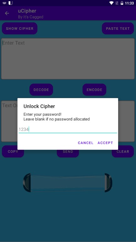 5. Agora você pode enviar mensagens codificadas um para o outro, copie o texto codificado para uCipher. Pressione o botão 'Decodificar' para ler a mensagem não criptografada.