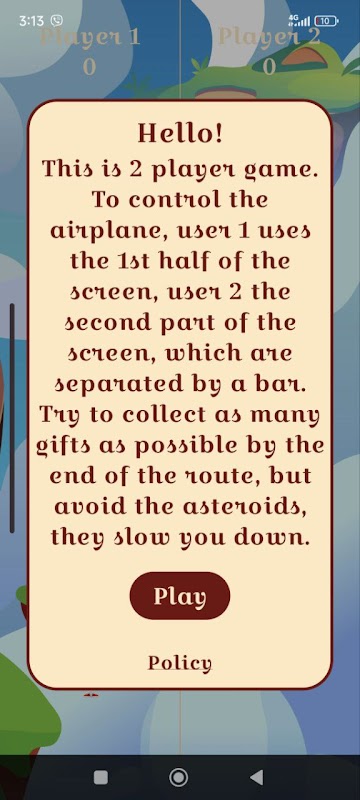 O jogo foi projetado para dois jogadores que jogam simultaneamente no mesmo dispositivo. A tela é dividida em duas partes: