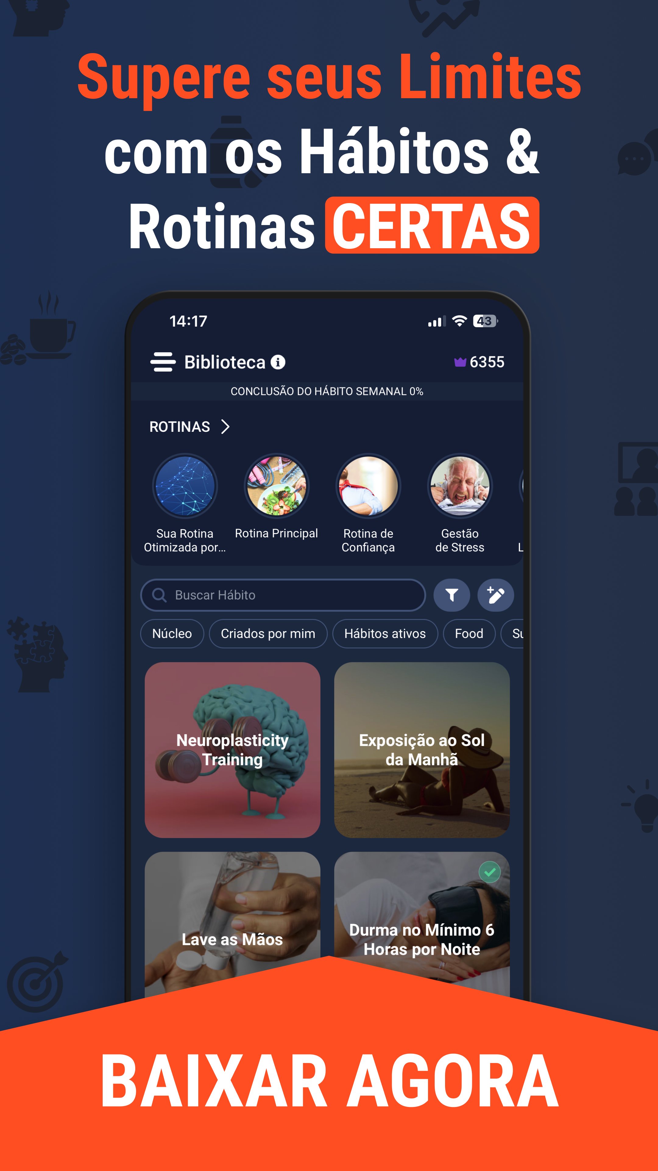 Selecione os hábitos da nossa biblioteca com base nas áreas que você deseja melhorar (foco, humor, motivação...)