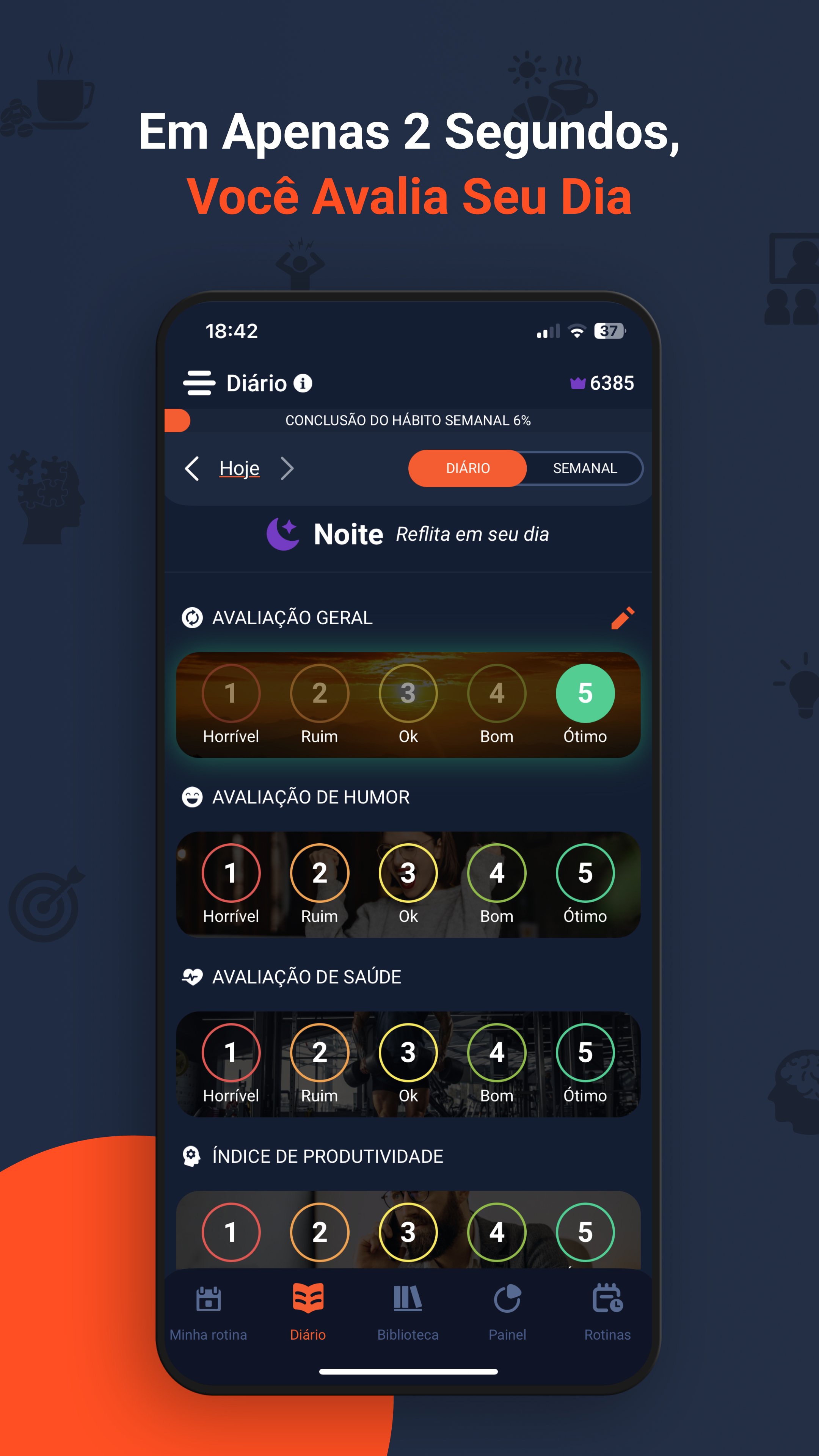 Em apenas 30 segundos, você acompanha seus hábitos diariamente e classifica seu dia.
