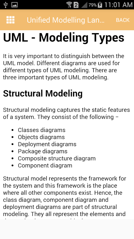 The topics that you will find in this application are as follows: building blocks related information, architecture related information, modeling types related information, basic notations related information, standard diagrams related information, class diagram related information, object diagram related information, component diagram related information, deployment diagram related information, use case diagram related information, interaction diagram, state chart diagram related information, activity diagram related information.