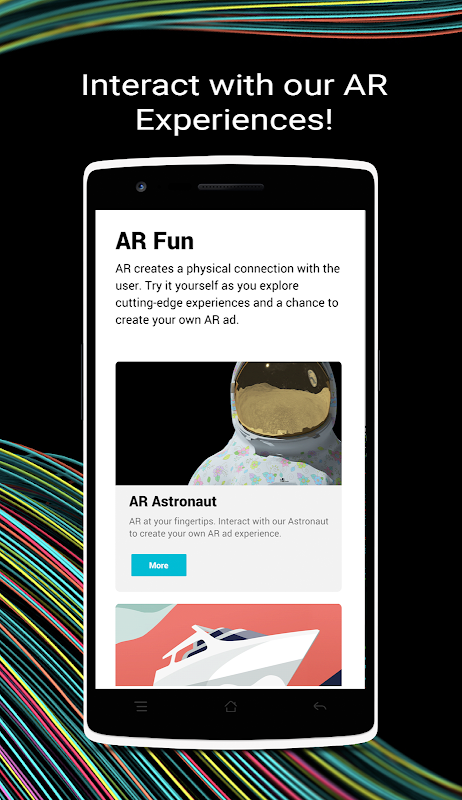 The Unity Ads Showcase app demonstrates how Unity’s platform can create compelling AR, VR, and Playable ads and interactive experiences to drive engagement and excitement for your brand.