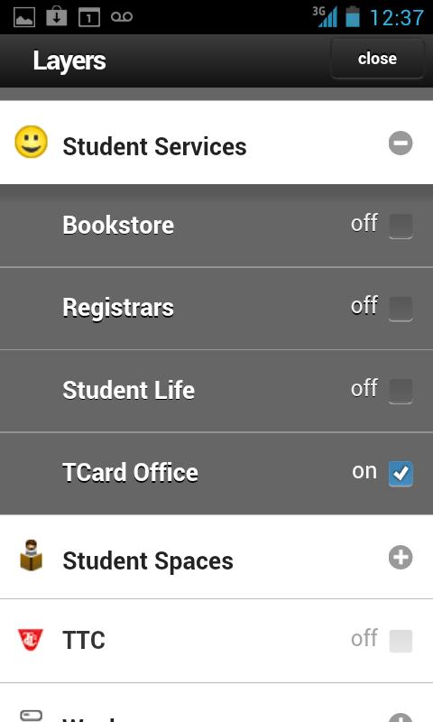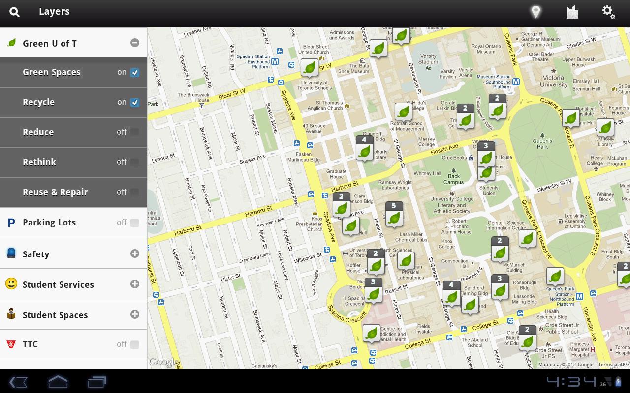 This Google-based, layered map designed for the Android helps members of the U of T community, particularly people who are new to the campus, navigate using meaningful search words, such as "library" and "registrar". The first map layers include accessibility, food, wireless, student services (including registrars), car parking, bike racks, TTC subway stations, green sites (including green roofs and battery drop-off sites), safety, study spaces and washrooms. It is a living map, one that will develop more layers as it grows.