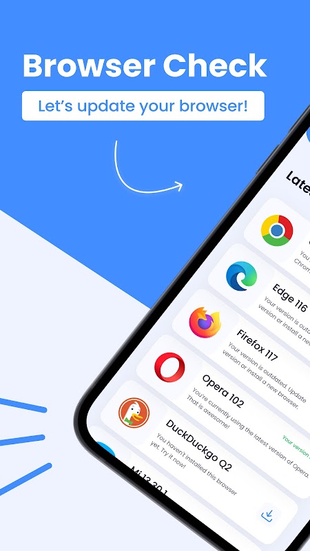 Este aplicativo foi projetado para atualizar rapidamente navegadores em dispositivos Android. Você pode usá-lo para determinar quais versões do programa de navegação na web são usadas e atualizá-las para a versão atual.