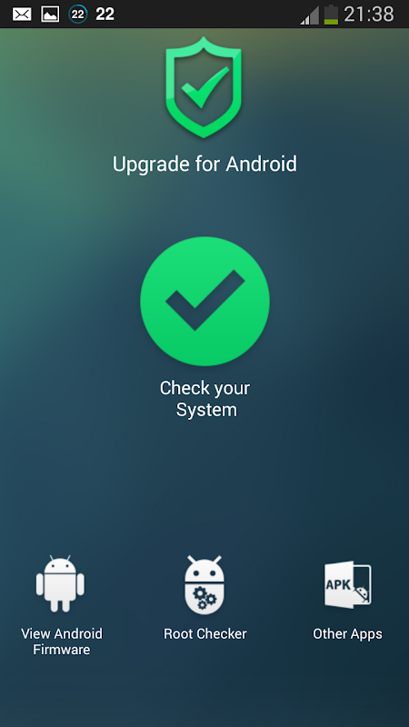 Esta aplicação é capaz de testar seu dispositivo e determinar se ele tem os requisitos mínimos para executar o mais recente firmware Android, você pode usá-lo para testar seu sistema para cada versão android para a frequência da CPU necessária, RAM e memória interna. Ele verifica se o dispositivo está rooteado / desbloqueado e atualizado.