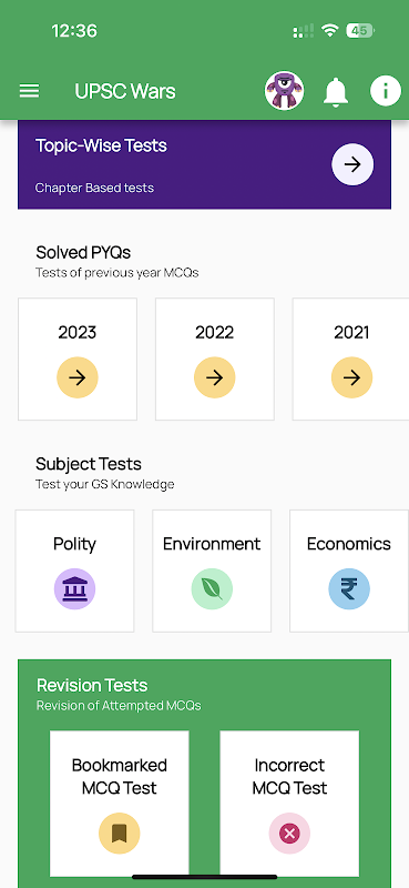 UPSC Wars oferece séries de testes gratuitos para prática (upsc preliminares 2025). Você encontrará documentos de perguntas resolvidas preliminares do Upsc de alta qualidade com dicas detalhadas. Pratique testes simulados UPSC de uma forma divertida. Testes práticos baseados em assuntos atuais do upsc 2025, testes baseados em trabalhos preliminares resolvidos do upsc do ano anterior.