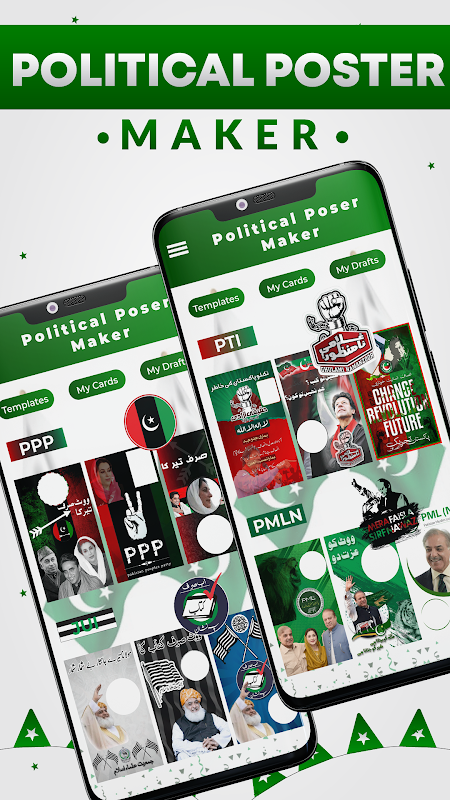 Este fabricante flexível de eleição não se limita apenas aos projetos flexíveis PTI e PMLN, mas também abrange projetos flexíveis JUI e projetos flexíveis PPP também estão incluídos. Então, se você quiser fazer qualquer cartaz de jalsa em urdu ou representar sua festa por banner de festa, este aplicativo é para você. Este é um criador de flex de eleição completo e tem todos os recursos do criador de pôsteres em urdu com foto.