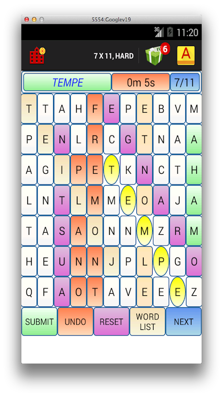 This is a highly customizable word search puzzle in which various words are arranged randomly and are "hidden" in a grid going in many directions, and your objective is find those words. You can select the size of the grid in which you want to play. You can also select the difficultly level - Easy (Words are from Top->Bottom, Left->Right, Diagonal top left -> bottom right), Medium (easy + Bottom->top and Right->Left) and Hard (All 8 Directions). You can also choose whether you want the words to overlap or not. You can also select the minimum word size, thereby ensuring that you see bigger words. Select the word and then click Submit to check if you have the right word. Use "Word List" to see all the hidden words. When you guess a word successfully, the app tells you the meaning of the word. It also keeps track of your score in terms how many words you were able to discover. Click on the text on the title bar (eg. AUTO X AUTO, HARD) to customize options.